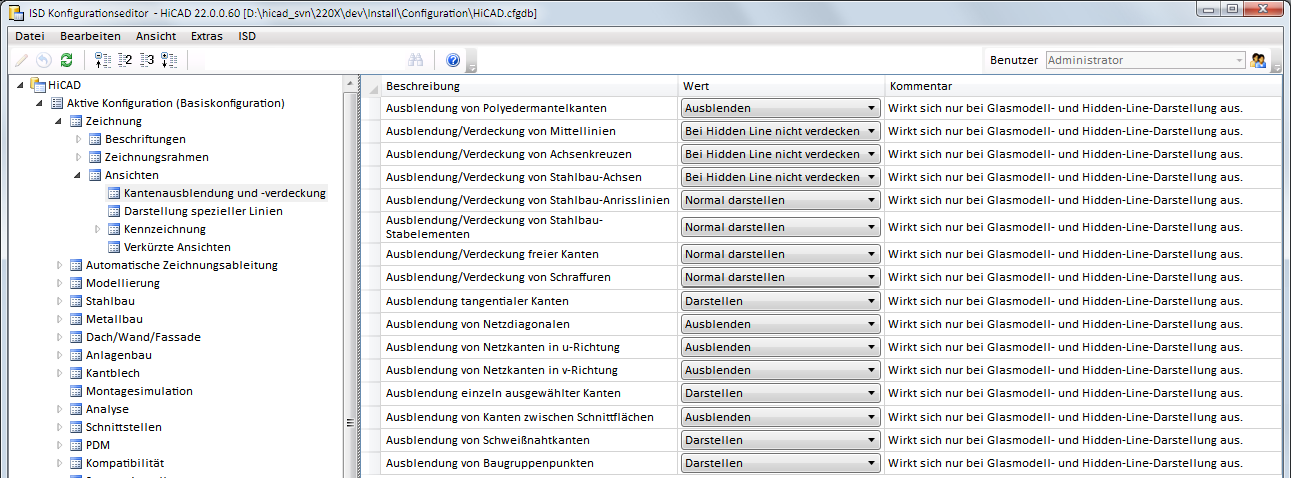 - Die Voreinstellungen für das Dialogfenster lassen sich im Konfigurationsmanagement ändern und zwar unter Zeichnung > Ansichten > Kantenausblendung und -verdeckung.