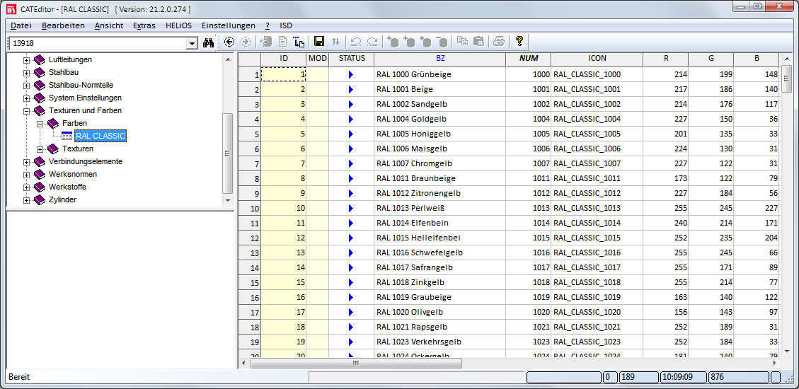 laden, haben Sie Zugriff auf die RAL-Farben der Tabelle K3. Diese sind im Katalogeditor unter Texturen und Farben > Farben > RAL CLASSIC definiert.