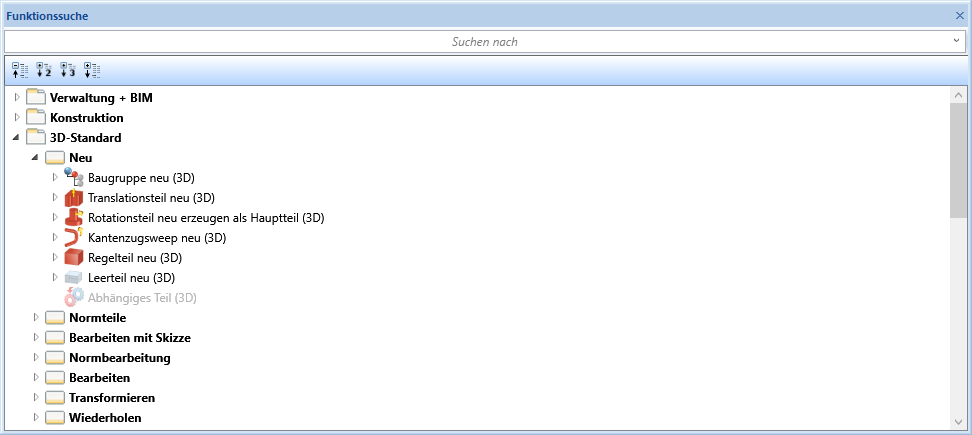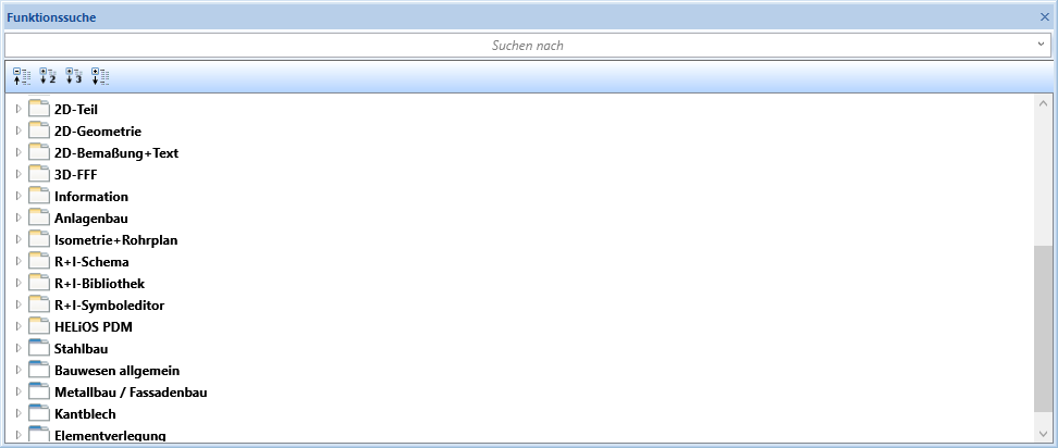 HiCAD bietet ein sehr umfangreiches Funktionsspektrum. Da kann es schon einmal vorkommen, dass man eine bestimmte Funktion sucht, aber nicht mehr genau weiß, auf welchem Ribbon die Funktion zu finden ist. In solchen Fällen kann das Andockfenster Funktionssuche Abhilfe schaffen.