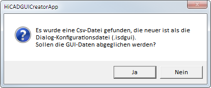 - Wird ein Benutzerdialog im HiCAD Dialogeditor geöffnet und HiCAD stellt fest, dass die zugehörige CSV-Datei neuer ist, dann erscheint eine entsprechende Meldung.