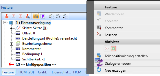 - HiCAD stellt automatisch fest, ob der Benutzerdialog einer bereits verlegten Variante nachträglich geändert worden ist. Wenn Sie dann in einer entsprechenden Elementverlegung mit der rechten Maustaste auf das Feature Elementverlegung klicken, steht Ihnen im Kontextmenü die Funktion Dialoge erneuern zur Verfügung. Mit dieser Funktion lässt sich der beim Bearbeiten der Elementverlegung angezeigte Benutzerdialog aktualisieren.