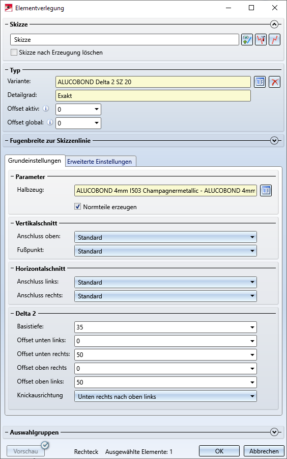 Die Bedienung des Dialogfensters erfolgt im wesentlichen analog zu den anderen ALUCOBOND® Kassetten. Als mögliche Anschlussarten stehen hier nur Standard und Ohne Laschen zur Verfügung.