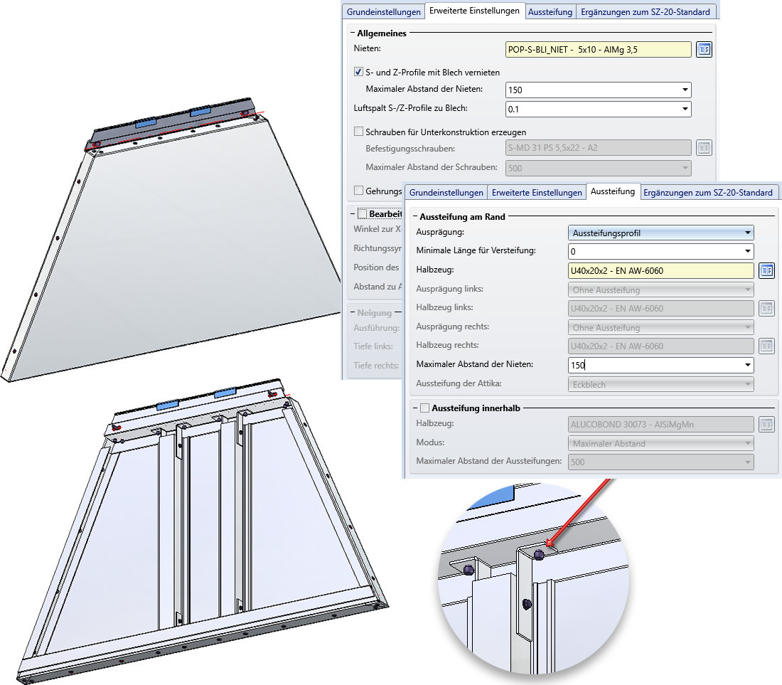 Sollen die S- und Z-Profile (Aufhängungsprofile) mit dem Blech vernietet werden, dann aktivieren Sie die entsprechende Checkbox und bestimmen Sie den maximalen Abstand der Niete.