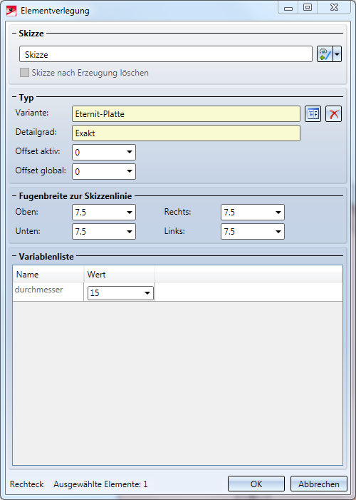 - Nun können Sie beide Teile wieder speichern und die Unterkonstruktion sowie die Elementverlegung aktualisieren. Im Dialogfenster Elementverlegung erscheint dabei die Variable durchmesser, wo Sie ihren Wert festlegen können.