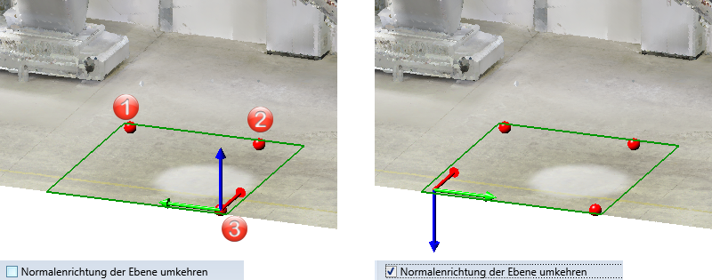 Die Normalenrichtung wird analog zur Funktion Ebene aus Punktwolke wählen bestimmt. Das heißt, die Z-Richtung zeigt zum Betrachter.Durch Aktivieren / Deaktivieren der Checkbox lässt sich die Normalenrichtung umkehren.