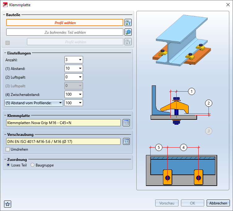 Wählen Sie das Profil, das mit Klemmplatten befestigt werden soll und dann das Profil oder Blech an dem die Klemmplatten verschraubt werden sollen. Im Falle eines Bleches können Sie ein weiteres Profil mit Klemmplatten am Blech befestigen. Aktivieren Sie dazu die Checkbox und wählen Sie dann das Profil.