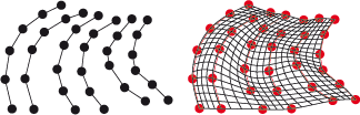 The parameter lines of the created freeform surface are cubic splines, i.e. they can be continuously differentiated twice, they are smooth, without tangential constraints and interpolating. |