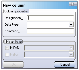 The new column will be inserted at the end of the table. Columns with an attribute link are identified by the symbol for HiCAD or the