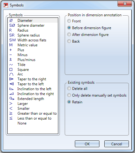 Select the desired symbol and specify the position of the symbol in the annotation. Specify in the Existing symbols area how to proceed with already existing symbols of a dimension.