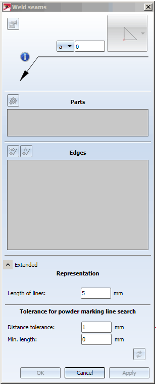 At the top of the dialogue window you can specify the settings for the weld seam tag, i.e. the weld seam type, and further information required for this type, such as the seam thickness. Instead of a selection from dimension a to dimension z you can also choose an empty entry from the listbox.