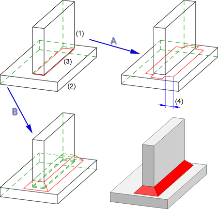 In the example shown below, a fillet weld has been inserted between the two cuboids (1) and (2). The powder marking lines (3) were determined automatically. Case A shows a symbolic, (4 = distance of the lines), case B a solid representation.