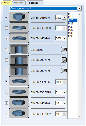 After choosing a configuration file on the Options tab, HiCAD will check upon selection of a bolt whether the file contains any configurations for this bolt. If this is the case, you can select the desired configuration from the list box at the top of the dialogue window.