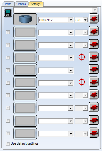 You use the Parts tab to access all available bolts, washers, nuts, bores, countersinks and threads of which the bolting can consist.