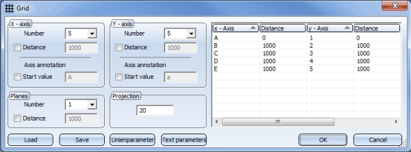 Click this button to save the current grid settings. The data is saved in the HiCAD subdirectory Makro 3-D/Raster under the specified name with the extension .RST. The RST files can be reused at any time – even for other steel engineering constructions. |
