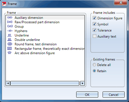 Select the desired frame or brackets and specify the elements of the annotation that you want to put into the frames or brackets. Specify in the Existing frames area how to proceed with already existing frames of a dimension.