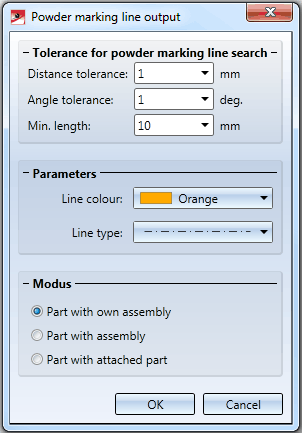Applies to the active part. After closing the dialogue window, HiCAD will prompt you to identify the parts causing the powder marking lines.