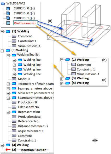 In the example shown below, the two weld seams on the left hand side were created in one step. In the process, the main part Weld seam (a) was created. After this, the weld seam function was called again (while the main part was still active) and the right weld seam was created. The feature log then contains the creation feature (b) and two weld seam features (c). In our example, feature (3) belongs to the two first created weld seams (for this reason there are four entries under Welding line list).
