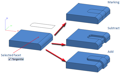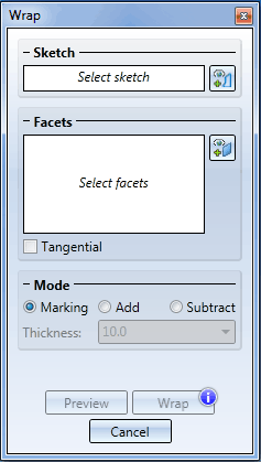 Use this function to create raisings, indentations and imprints on parts by wrapping of sketches onto part surfaces. Proceed as follows: