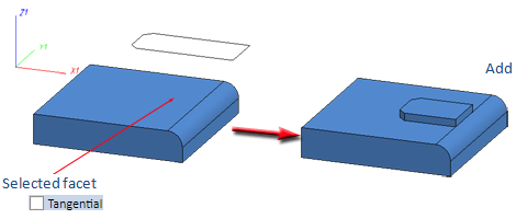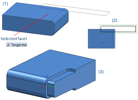 Click the icon and identify the surface of the part that you want to process. If the Tangential checkbox has been activated, HiCAD will also process the surfaces that are connected to the selected surfaces via tangential edges.