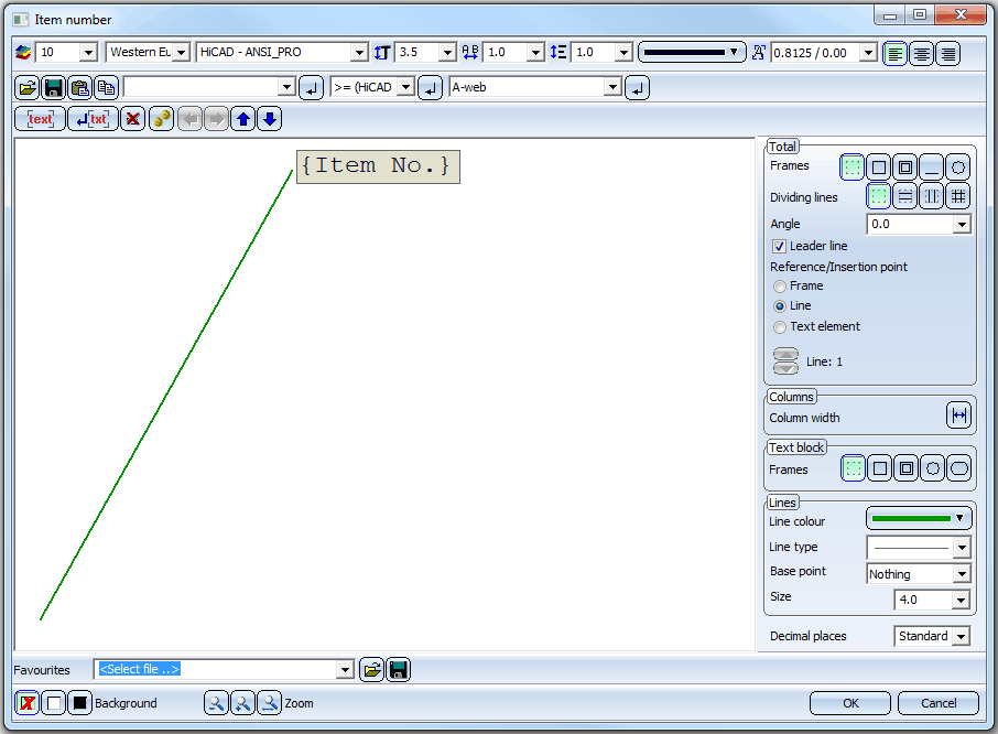 You can then specify the representation of the leader lines in the Lines area, i.e. the line colour, line type and the base point (the symbol of the leader line).