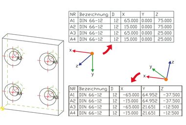 The bore table normally refers to the specified reference point and the world coordinate system. However, you can also create the bore table with reference to a local coordinate system. For this, a local coordinate system needs to be active when the function is called!