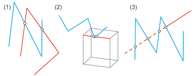 o = new division point Left: Intersection with c-edge, Middle: Intersection with edge, Right: Intersection with line |