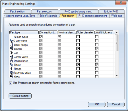 If you want to connect a flange to a flange connection of another part, the value for pressure that has been assigned to this other part will be used as search criterion if the Use Pressure as search criterion for flange connections checkbox has been activated.