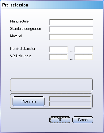 As a nominal diameter (= 50) has been assigned to the pipe-line, the appropriate field in the mask contains a pre-set value and is locked. As the Pre-selection via pipe class and Pre-selection mask option has also been selected in the Part selection tab, and material is a pipe class attribute the Material input field is blocked. You can now specify other settings in the white input fields, e.g. specify a range of values for wall thickness. If you do not want to define a range, simply enter a specific value in the left input field - if the right field is empty, the entered value is automatically recognised as the top limit.