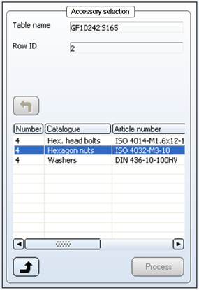 If you want to process or define an accessory list, you need to switch to the editing mode by clicking the Process button. This enables you to select the accessory parts. If the editing mode is active, the Process button is greyed out.