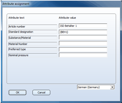 The constant attributes that are predefined for the selected part type can be edited here. When you click the the Attributes button, the Attribute assignment window will be displayed, where the constant attributes will be listed. |