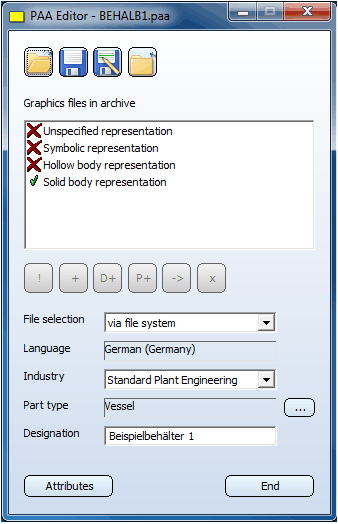 Use this tool to create a PAA archive from the files for the various representations of a Plant Engineering part, or to change the contents of a PAA archive. A prerequisite for this is that the part is not parameterised, i.e. that it represents no variant.