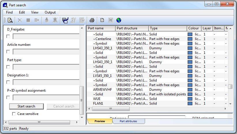 The search result will be shown on the right hand side of the dialogue window. A "yes" in the P+ID symbol assignment column means that a P+ID symbol has been assigned to the part, "no" means that no P+ID symbol has been assigned. If the cell is left blank, this means that the part has not been considered for the check.