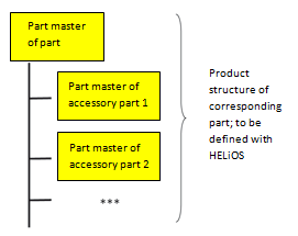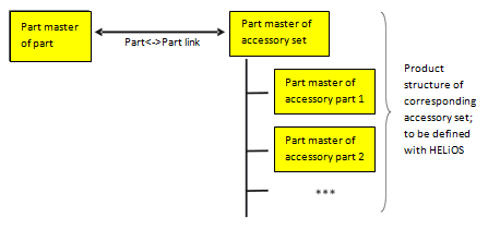 Accessory parts which are assigned depending on the fitting situation will only appear in correct quantities in the product structure BOM, if the part masters of the accessory parts were assigned, via product structures, to so-called accessory sets, which in turn must be linked, via a Part-Part link, to the part masters of the parts to which the accessory parts belong.