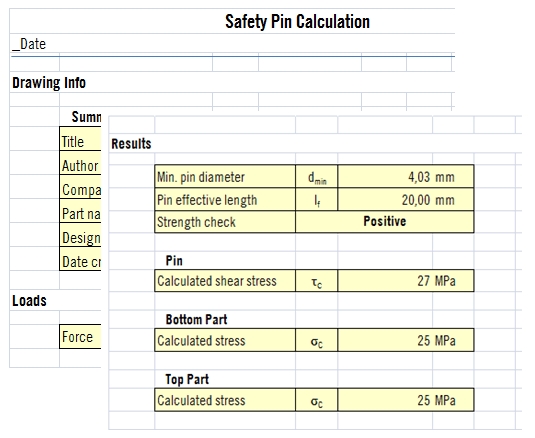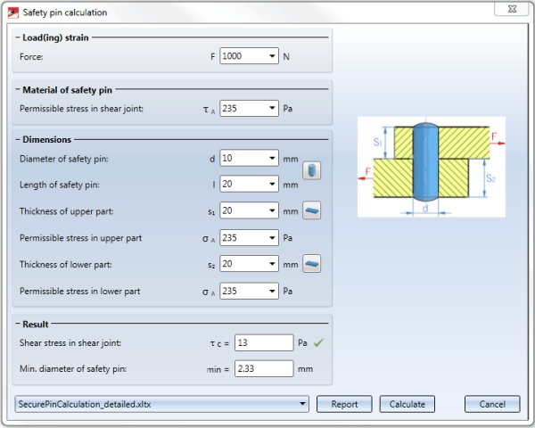 You use this function to check whether a cylindrical pin that was inserted for the connection of two parts has the required stability to withstand a specific force. The function calculates the shear force in the shear joint, and the required minimum diameter of the pin.