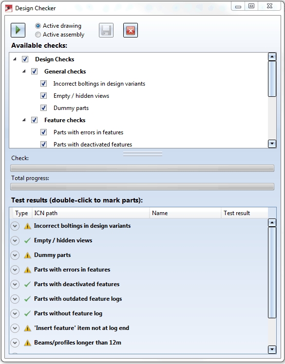 The Design Checker is a tool that enables you to increase the quality of your drawings and reduce costs and time through an early detection of errors in the design. You can auto-check your drawings for their compliance with specific construction guidelines; it detects, for example, invalid features, incorrect bolting sets, dummy parts, and much more. If any errors are detected, HiCAD issues an appropriate message and suggests corrections.