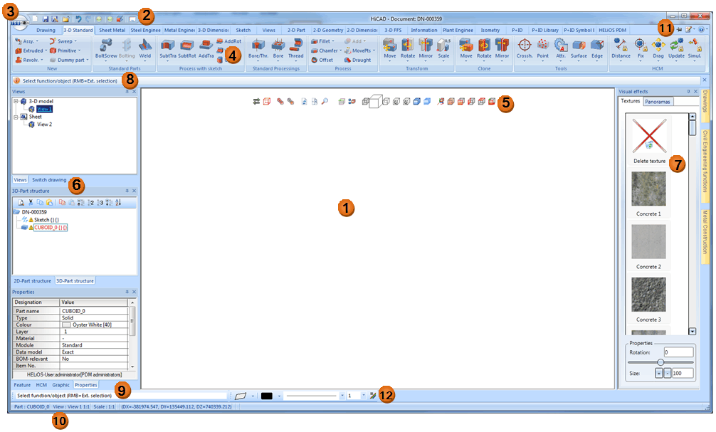 The HiCAD User Interface consists of the following areas: