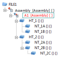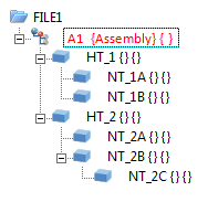Example of the ICN structure of a part drawing consisting of main parts (HT) and sub-parts (ST). On the left, a dummy part (dummy) was used to define the assembly, on the right, the assembly component type.