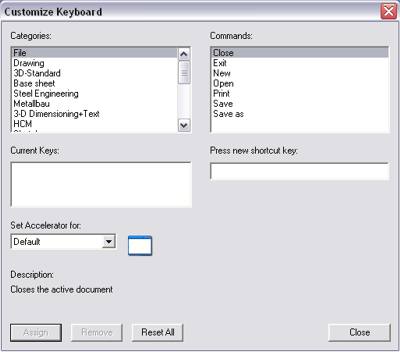 for the key combination CTRL+X. Click the Remove button to remove a selected key combination from the Current keys window. Click Reset all to delete all assigned key combinations.