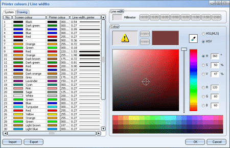 Here you have the option to assign specific print colours and/or line widths to the current System colours and Drawing colours.