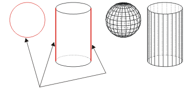 When generating 3-D parts, you can model curved surfaces analytically or polyhedrally. HiCAD enables you to use two different methods for describing higher-degree surfaces, such as the lateral surfaces of cylinders or spheres: