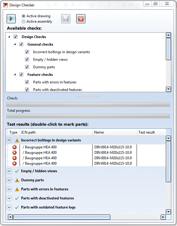 The Design Checker is a tool that enables you to increase the quality of your drawings and reduce costs and time through an early detection of errors in the design. You can auto-check your drawings for their compliance with specific construction guidelines; it detects, for example, invalid features, incorrect bolting sets, dummy parts, and much more. If any errors are detected, HiCAD issues an appropriate message and suggests corrections.
