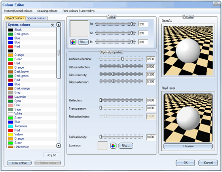 Object colours are the edge and surface colours - including their optical properties - used for the representation of 2-D drawings and 3-D model drawings. From Version 2008 onwards, HiCAD distinguishes between Drawing colours and System colours.