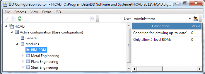 If you want to use the BIM-PLM suite for Steel Engineering, activate the Steel Engineering PDM (3-D) checkbox in the Parameter configuration dialogue window. This will automatically configure HiCAD title blocks, drawing frames, BOM-templates and various HELiOS masks appropriately for BIM-PLM utilisation in Steel Engineering. These BIM-PLM-specific settings can either be selected for the workstation or for individual users.