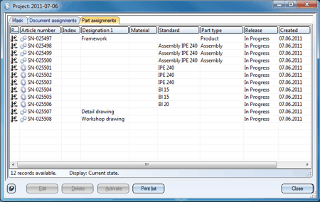 The Document assignment and Part assignment tabs provide information about the documents (model drawings, production drawings etc.) and parts (assemblies, beams, plates etc.) which are linked to the active project.