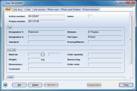 Part master Part master for active drawing Use this function to display the part master of the active drawing, and edit these data if desired. When you call this function, the Part dialogue window will be opened. It consists of various tabs enabling you to display where-used lists, the product structure, linked documents, etc. |