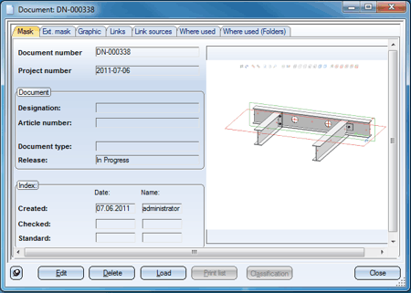 Document master Document master for active drawing Displays the document master (if there is any) of the active drawing in the Document dialogue window. Frequently used functions, such as Edit, Delete etc. can also be called via the buttons. Further editing functions can be accessed via the context menus (RMB) of window and tabs. |