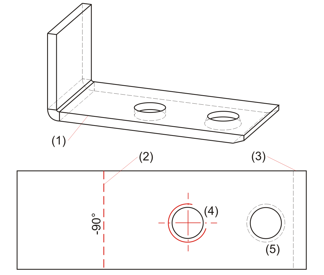 This function generates the development of a sheet part. The hidden edges are displayed dashed. Identify an edge of the basic sheet. The development then attaches to the cursor and can be freely positioned in the drawing. |
