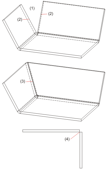 The Close cornerfunction lengthens or shortens, as applicable, the sheets up to the common intersection point of the internal edge. If you have chosen the Close corner, bend zone closed function, the bend zone is also closed.