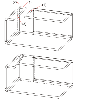 Use this function to mitre-cut (and lengthen) flanges that do not overlap and do not have the same length. The flanges must be located in one plane.