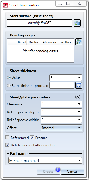 Use the New sheet from surface function to construct, via specification of a sheet thickness, new sheet metal parts from the surfaces of a 3-D body. After selecting the function, the following dialogue window will be displayed: